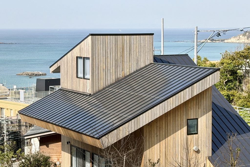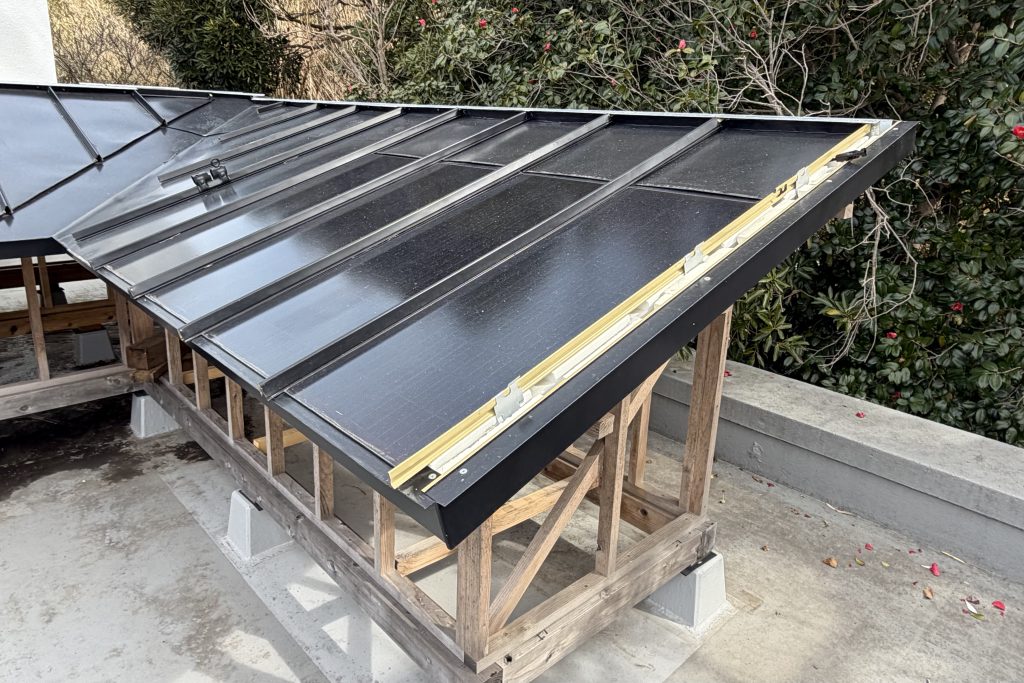 神奈川県横須賀市にあります、株式会社モノクローム(秋谷オフィス)で実際の屋根に施工されたもの、取付け方法を確認するモックアップなど見せていただきました。