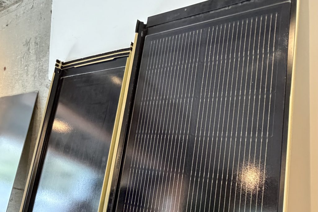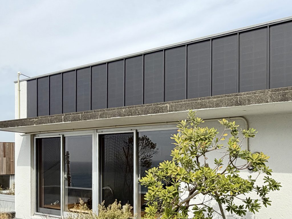 写真は、既存建築の庇上部の壁面にテスト施工されたものです。写真一番左のパネル1枚だけガルバリウムの板金(太陽光なし)で、それ以外が全て太陽光パネル一体型の壁面ユニットです。