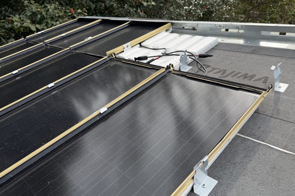 パーツ構成としては、屋根板金の上に太陽光パネルが貼り付けてあり、屋根板金の下に通線ジョイントをしています。